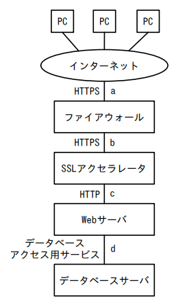 図のような構成と通信サービスのシステムにおいて、Webアプリケーションの脆弱性対策のためのWAFの設置場所として、最も適切な箇所はどこか。ここで、WAFには通信を暗号化したり、復号したりする機能はないものとする。