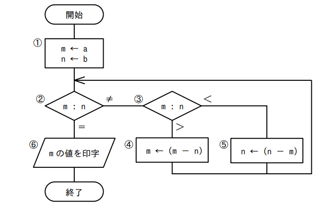 この問題は、与えられた流れ図における処理の実行順に注目して、最終的に「mの値を印字する(⑥)」まで至るための適切な初期値の関係を導き出すものです。流れ図の内容は、ユークリッドの互除法に似た処理で、mとnの最大公約数を求めるような構造になっています。