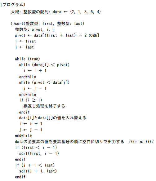 次の手続 sort は,大域の整数型の配列 data の,引数 first で与えられた要素番号から引数 last で与えられた要素番号までの要素を昇順に整列する。ここで,first < last とする。手続 sort を sort(1, 5) として呼び出すと,/*** α ***/ の行を最初に実行したときの出力は “【 】” となる。