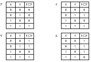 X及びYはそれぞれ0又は1の値をとる変数である。X□YをXとYの論理演算としたとき、次の真理値表が得られた。X□Yの真理値表はどれか。