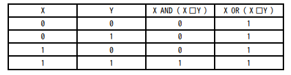 Xが0のときのみ1になるような表になっており、X NOR Yに近い動作をしますが、これも「X AND (X□Y)」と「X OR (X□Y)」の結果と合致しません。
