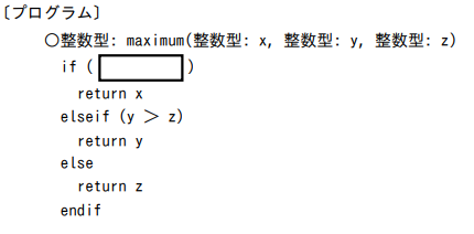 本問は、3つの整数 x, y, z のうち最大の値を返す関数 maximum を構築するための適切な条件文を選ぶ問題です。プログラムでは、最初の条件として if 文で最大値が x であるかどうかを判定しています。