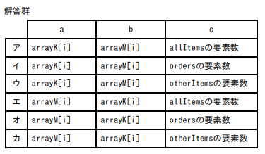 ウ(arrayK[i], arrayM[i], otherItemsの要素数):