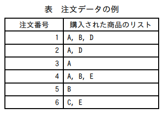 一度の注文で購入された商品のリストを,注文ごとに記録した注文データがある。表に,注文データの例を示す。