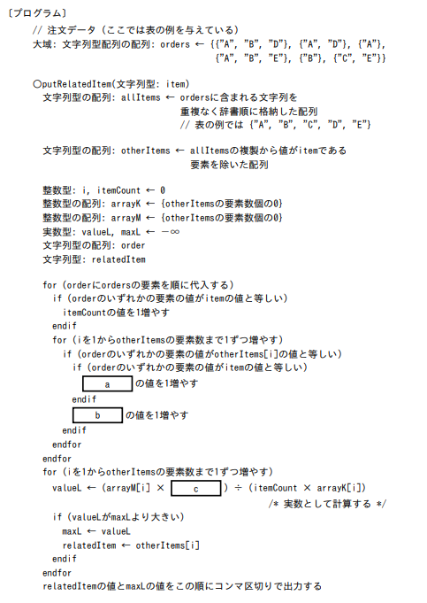 次のプログラム中の a ~ c に入れる正しい答えの組合せを,解答群の中から選べ。ここで,配列の要素番号は 1 から始まる。