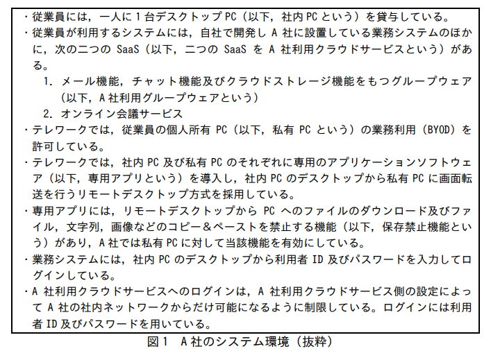 A社は従業員450名の商社であり、昨年から働き方改革の一環として、在宅でのテレワークを推進している。A社のシステム環境を図1に示す。