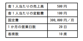 - 客1人あたりの変動費:100円 – 固定費:300,000円/月