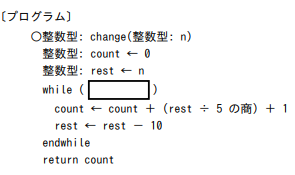 この問題は「お金の両替問題」に似た仕組みを考える問題です。プログラムchangeは、10円玉を使う枚数ごとに場合分けして組合せの総数を計算しています。最初に「rest ← n」として、残りの金額restがn円から始まることに注目します。ここでwhile文は「10円玉が使える間は繰り返す」仕組みになっているため、条件は「rest ≧ 0」が正しいと判断できます。