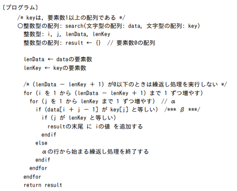 関数searchをsearch({”a”, “b”, “a”, “b”, “c”, “a”, “b”, “c”, “a”, “b”, “c”}, {”a”, “b”, “c”})として呼び出すと、/*** β ***/の行の条件式が真となる回数は【   】回である。